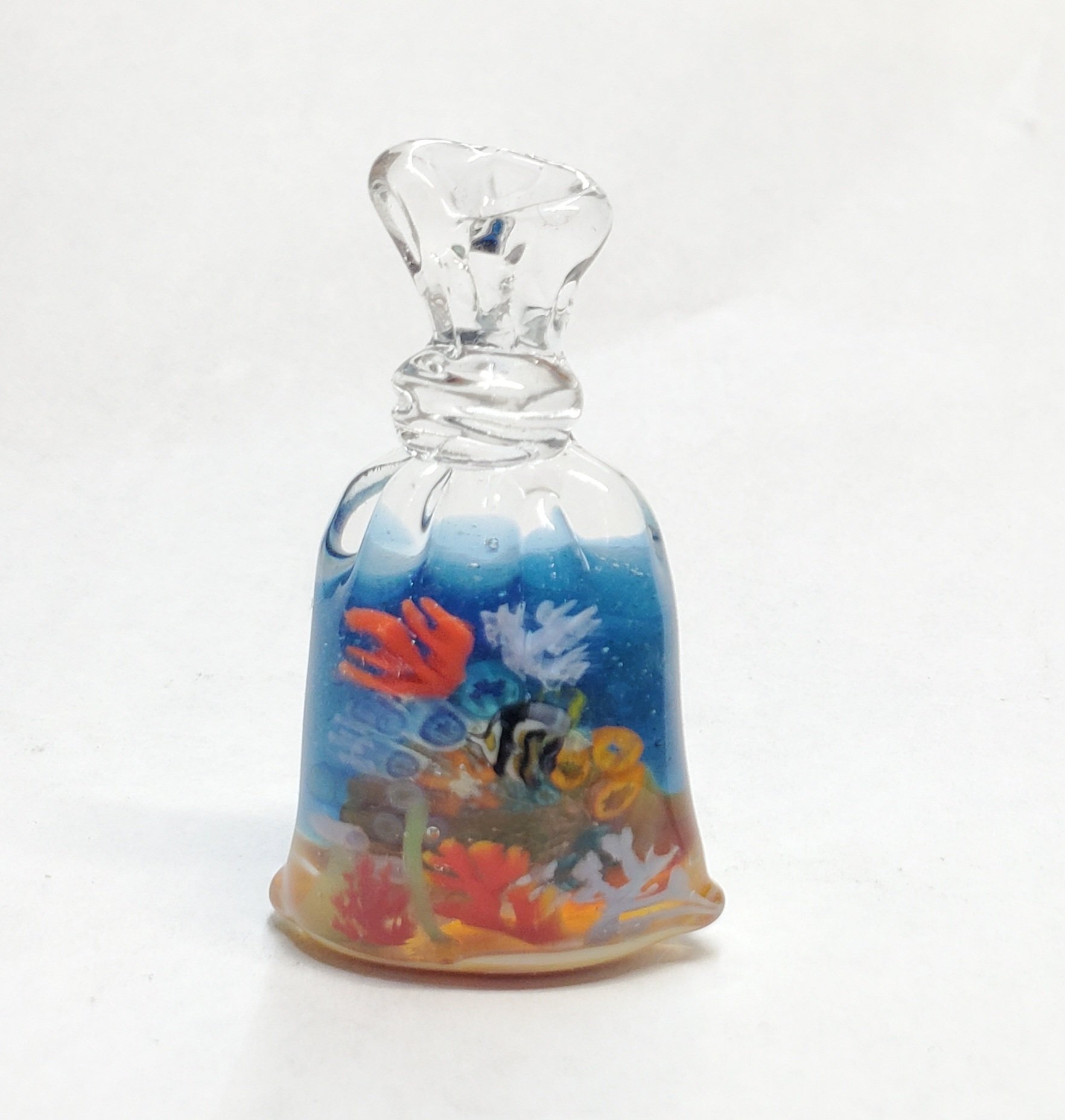 This series of pendant are made from the highest quality, american-made borosilicate glass. The scenes within have been carefully arranged using a number of individually crafted murrini imaged, each of which take multiple days and many hours to design and construct. Each bag is truely a one-of-a-kind piece of art. The loop in the back is large enough to be strung on a cord or chain of up to 5mm and is signed and dated "Roo 25